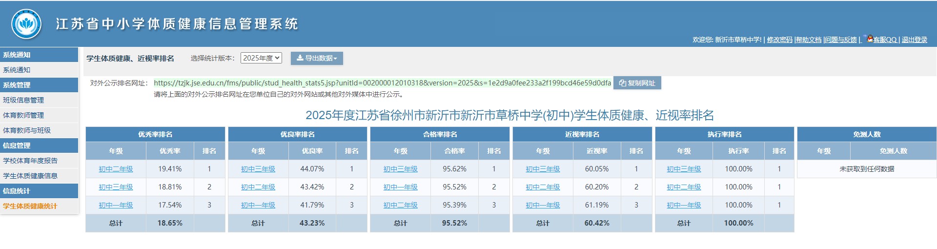 2025年度江苏省徐州市新沂市新沂市草桥中学(初中)学生体质健康、近视率排名